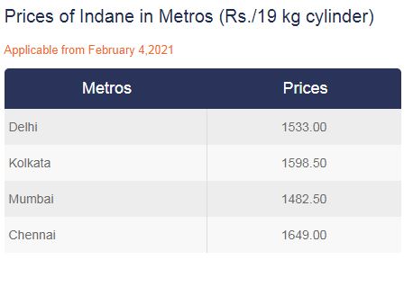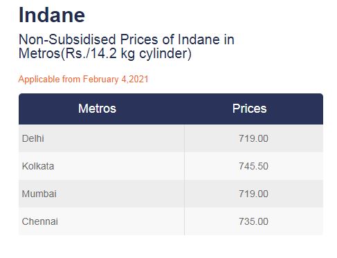 हाल के कुछ माह में महंगाई दर में काफी अधिक वृद्धि देखने को मिली है। सरकारी तेल विपणन कंपनियों ने घरेलू गैस के दामों में एक बार फिर इजाफा हो गया है। इंडियन ऑयल कॉरपोरेशन लिमिटेड की वेबसाइट के मुताबिक आज यानी 4 फरवरी से उपभोक्ताओं को 14 किलोग्राम वाले नॉन सब्सिडी घरेलू गैस सिलेंडर के लिए ज्यादा पैसे चुकाने होंगे। इस बार 25 रुपये प्रति सिलिंडर बढ़ाए गए हैं। इसके लिए दिल्ली में 719 रुपये प्रति सिलेंडर, कोलकाता में 745.50 रुपये प्रति सिलेंडर, मुंबई में 710 और चेन्नई में 735 रुपये प्रति सिलेंडर देना होगा।