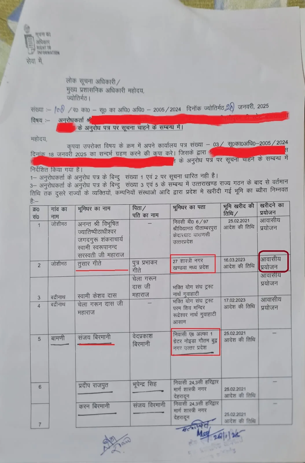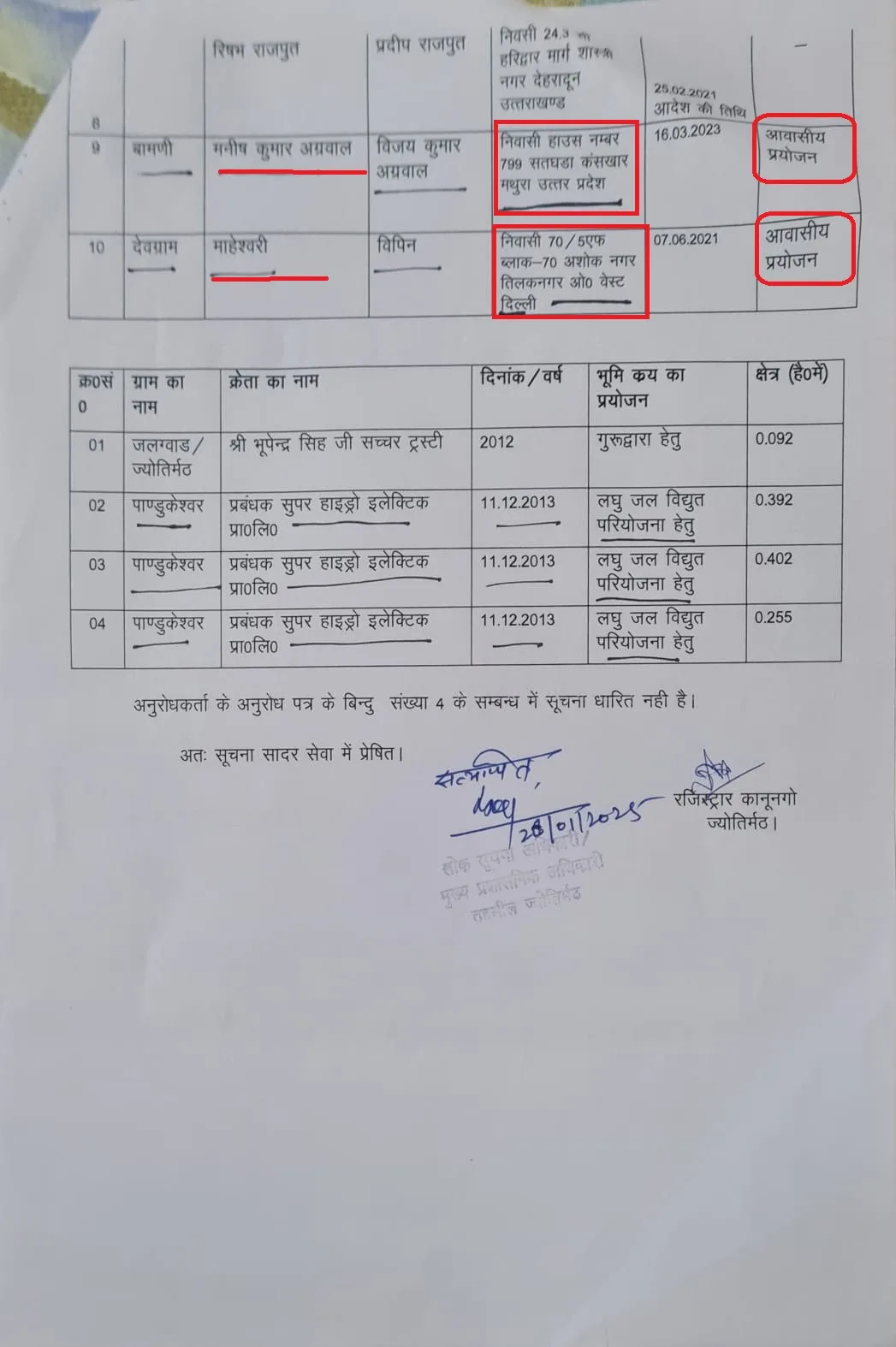 देहरादून, 10 जुलाई — उत्तराखंड के मूल निवासियों की ज़मीन और अस्मिता से जुड़ा मुद्दा एक बार फिर गरमा गया है। मूल निवास भू-कानून संघर्ष समिति द्वारा सूचना के अधिकार (RTI) के तहत जुटाई गई जानकारी से खुलासा हुआ है कि जोशीमठ और देवप्रयाग जैसे अति संवेदनशील क्षेत्रों के आस-पास के गांवों में बड़ी संख्या में बाहरी राज्यों — बिहार, उत्तर प्रदेश, हरियाणा और पश्चिम बंगाल के लोगों द्वारा ज़मीन खरीदी गई है। RTI के अंतर्गत मिले दस्तावेज़ों में स्पष्ट रूप से दिखाया गया है कि किन-किन बाहरी नागरिकों ने स्थानीय क्षेत्रों में कितनी जमीनें खरीदी हैं। नीचे दिया गया चित्र RTI के उसी दस्तावेज का हिस्सा है, जिसमें खरीदारों की सूची और उनका मूल राज्य दर्ज है।